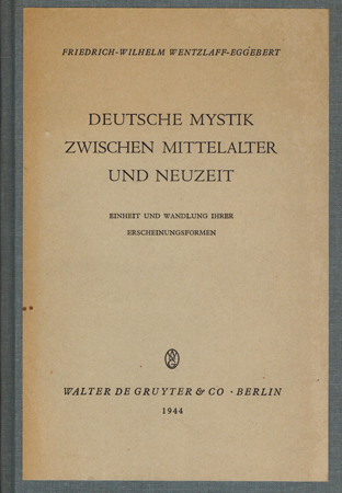 Wentzlaff-Eggebert, Friedrich-Wilhelm : Deutsche Mystik zwischen Mittelalter und Neuzeit. Einheit und Wandlung ihrer Erscheinungsformen. Walter De Gruyter, Berlin 1944. Gr.-8°. XVI, 339 S. priv. Lwd. mit aufgezogener OBroschur.