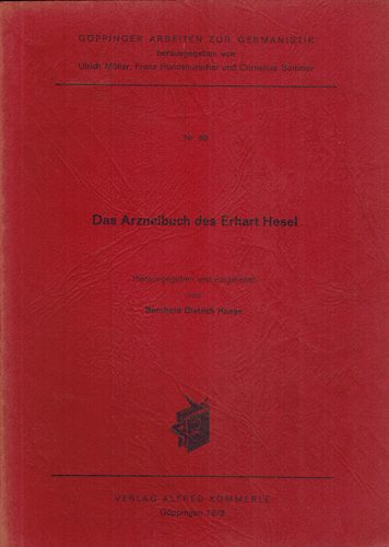 Haage, Bernhard Dietrich (Hrsg. u. Einleitung): Das Arzneibuch des Erhart Hesel. Verlag Alfred Kümmerle, Göppingen 1973. 1 (w), 3 Bl., 123 S., 3 Bl. Vlgs.-Anz. 1 (w), 1 Korrekturblatt (beiliegend) OKarton.