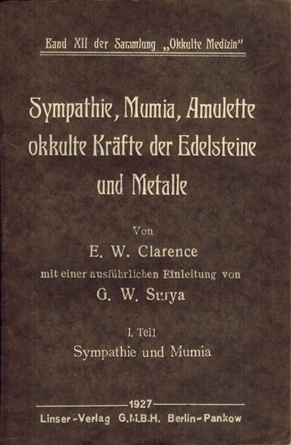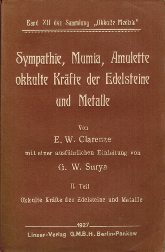 Clarence, E. W.: Sympathie, Mumia, Amulette. Okkulte Kräfte der Edelsteine und Metalle. [Teil I. u. II. = 2 Bde., so komplett]. Linser-Verlag G.M.B.H., Berlin-Pankow 1927. Mit einer ausführlichen Einleitung von G. W. Surya (= Demeter Georgiewitz Weitzer). XI, 321 S., 1 Bl. Vlgs.-Anz.; 2 Bl., 224 S., 3 Bl. mehrfach gefaltete Tafeln. OKarton Bde.
