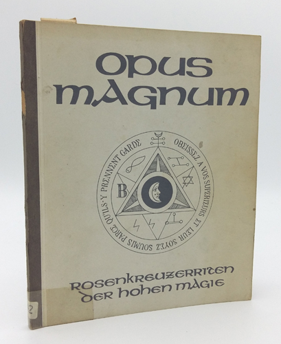 Umschlagtitel: OPUS MAGNUM. Rosenkreuzerriten der hohen Magie. – Dieses Exemplar trägt die registrierte Nr. 126. – Inhalt: 6 Vorblätter. Kreuz des Adepten. 1. Einführun. 2. Generalexorzismus. 3. Hauptexorzismus der vier Elemente. 4. Das Reich der vier Elemente. 5. Beschwörung der Sylphiden (Luftgeister). 6. Gebet der Luftgeister. 7. Beschwörung der Nixa (Wassergeister). 8. Weihe des Salzes. 9. Weihe der Erde. 10. Mischung. 11. Weihe des Wassers. 12. Gebet der Wassergeister. Beschwörung d. Salamander (Feuergeister). 14. Gebet der Feuergeister. 15. Beschwörung der Gnomen (Erdgeister). 16. Gebet der Erdgeister. 17. Magische Instrumente. 18. Die Talisman-Steine. 19. Die Tagesstunden und ihre Entsprechungen. 20. Die 7 Tage der Woche bei d. Weihehandlungen. 21. Die sieben magischen Handlungen. 22. Der Stern der Magier. 23. Weihe der Talismane (Schutzzeichen). 24. Weihe des Degens, der Sichel und des Dreizacks. 25. Anrufung des Salomo. 26. Ein Mahnwort. 27. Praktische Theurgie. 28. Zitation. 29. Evocation. 30. Invocationen. 31. Zeremonie der Anrufungen aus Liebe. 32. Zeremonie der Anrufungen aus Wissenschaft und Verstand. 33. Gebet des Paracelsus. 34. Zeremonie der Anrufung eines transzendentalen Subjekt und kosmischer Intelligenzen. [Nachwort]. – Der Text wurde von der Fraternitas Saturni in den 70er Jahren als Sonderdruck Nr. 1 neu aufgelegt. Die Arbeitsgemeinschaft für Religions- und Weltanschauungsfragen veröffentlichte den Text 1980 in: Magische Sonderdrucke und Interna der Fraternitas Saturni, Herausgegeben von F. W. Lehmberg (Hiram-Edition 10). – Beiliegend ein schmaler Papierstreifen mit Druckfehlerberichtigung. – Exemplar aus der Bibliothek von Walter Englert. Umschlag mit Bestandsnummer (M 42). Umschlag schwach berieben, gebräunt, leicht fleckig und gering bestoßen, das schmale Papier am Rücken mit kl. Fehlstelle.