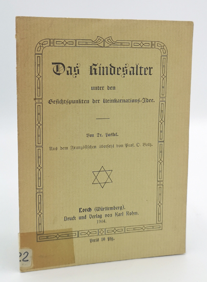 Pascal, Dr. (Ps.) = Theophile Pascal: Das Kindesalter unter den Gesichtspunkten der Reinkarnations-Idee. Druck und Verlag von Karl Rohm, Lorch (Württemberg) 1904. Kl.-8°. Aus dem Französichen übersetzt von Prof. O. Boltz. 13 S., 1 Bl. Vlgs.-Anz. OBroschur.