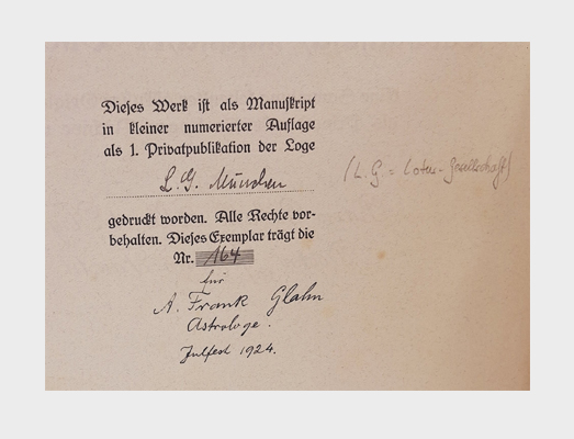 Cabbalistisch-magischer Bücherschatz. Eine Sammlung seltenster okkulter Originale als Privatdruck für Logen-Archive usw. Als Manuskript in kleiner (handschriftl.) numerierter Auflage als 1. Privatpublikation der Loge „L[otus] G[esellschaft] München“ (handschriftl.) gedruckt. Dieses Exemplar trägt die Nr. 164 [von 300 Exemplaren]. Darunter: (handschriftl.) für A. Frank Glahn, Astrologe, Julfest 1924. – Von O. W. Barth u. Heinrich Tränker herausgegeben. Zu O. W. Barth und Tränker siehe ausführlich bei Lechler: „Die Vorlage hierfür [vorliegendes Werk] stammte von Heinrich Tränker. Ursprünglich hatte Tränker geplant, das Faksimile zusammen mit Eugen Grosche durch die Pansophische Loge in Berlin zu veröffentlichen“ (kurzer Auszug). – Ackermann I, 789 „Das Werk ist nach einer alten, durch Zufall aufgefundenen magischen Fausthandschrift als Privatpublikation gedruckt worden. Es wurde nur in kleiner, nummerierter Auflage hergestellt und kam nicht in den Handel“. Wanderer S. 148, 35 (hier auch ausführlich zu den verschiedenen Drucken u. Varianten). Henning I, 3225 (mit irriger Angabe: um 1910). Zu einer Handschrift im Querformat mit 87 S. (von 1728), die eventuell als Vorlage gedient haben könnte, siehe auch Henning 1, 3153. Acht der Abbildungen zeigen „Geister“, die anderen meist magische „Circuly“. – Einband berieben und bestoßen. Kapitale begriffen. Buchblock nach der ersten Lage offen, danach wieder am Stück. Papier vereinzelt gering fleckig. – Exemplar aus prominentem Vorbesitz.