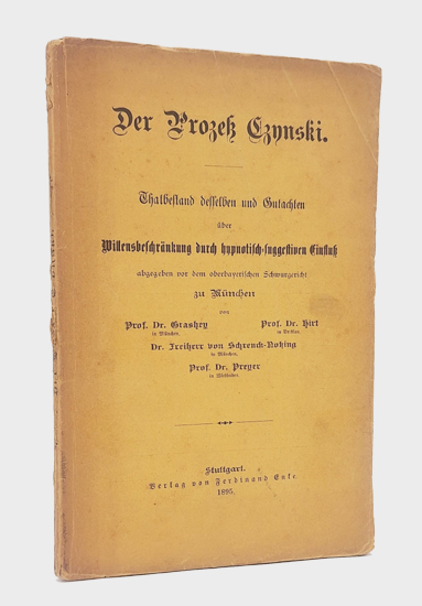 Grashey, Prof. Dr. [Hubert] / Hirt, Prof. Dr. [L.] / Schrenck-Notzing, Dr. [Albert] Freiherr von / Preyer, Prof. Dr. [W.]: Der Prozeß Czynski. Thatbestand desselben und Gutachten über Willensbeschränkung durch hypnotisch-suggestiven Einfluß abgegeben vor dem oberbayerischen Schwurgericht zu München. Verlag von Ferdinad Enke, Stuttgart 1895. Gr.-8°. 3 Bl., 102 S. OKarton.