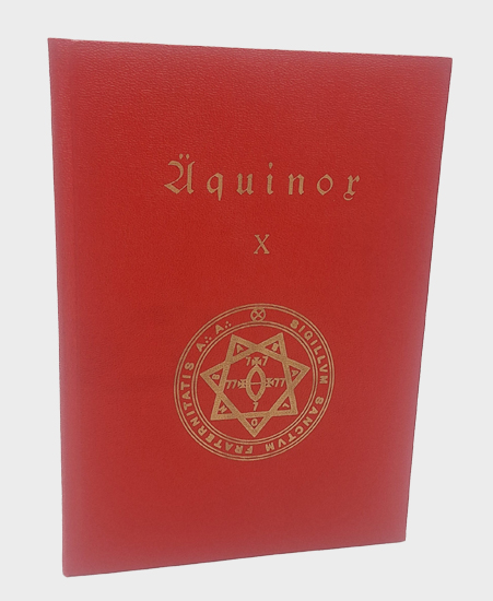 Äquinox X. Grimorium Sanctissimum – Liber XXV (Der Sternrubin), Liber XXXVI (Der Sternsaphir), Liber V vel Reguli. Verlag Psychosophische Gesellschaft, Schweiz 1959. 1 Bl., 42 Seiten, 2 Bl. Vlgs. Anz.. 1. Bl. Werkdruck in Kunstleder mit goldpr. und goldgepr. Sigill und OUmschlag.