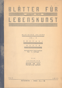 Blätter für angewandte okkulte Lebenskunst. Mai 1953 (Heft 38). Herausgegeben (als Privatdruck) von Gregor A. Gregorius. Meister der Loge Fraternitas Saturni Orient Berlin, Berlin 1953. 4°. 1 Bl., 43 S. Typoskriptdruck mit Klammerheftung und Fälzelstreifen.