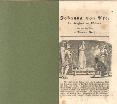 Roth, Theodor [Übertragung aus dem Englischen]: Johanna von Arc. Die Jungfrau von Orleans. Druck von Scheible, Rieger und Sattler, Stuttgart o.J.[1847]. Kl.-8°. 40 S. eingebunden in neuen Karton mit Leinenpfälzelstreifen.