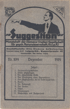 Siemens, Otto (Hrsg.): „Suggestion“. Monatsheft der Siemens-Studien-Gesellschaft für psych. Naturwissenschaft. Nr. 109. Selbstverlag Otto Siemens, Leipzig 1919. 32 S. illustr. OKarton.