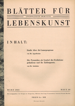 Blätter für angewandte okkulte Lebenskunst. März 1955 – [Heft 60]. Herausgegeben (als Privatdruck) von Gregor A. Gregorius. Meister der Loge Fraternitas Saturni Orient Berlin, Berlin 1955. 4°. 1 Bl. (Deckblatt m. Titel), 13 Bl. Typoskriptdruck mit Klammerheftung und Fälzelstreifen.