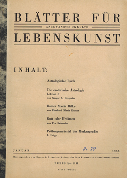 Blätter für angewandte okkulte Lebenskunst. Januar 1955 – [Heft 58]. Herausgegeben (als Privatdruck) von Gregor A. Gregorius. Meister der Loge Fraternitas Saturni Orient Berlin, Berlin 1955. 4°. 1 Bl. (Deckblatt m. Titel), 21 Bl. Typoskriptdruck mit Klammerheftung und Fälzelstreifen.