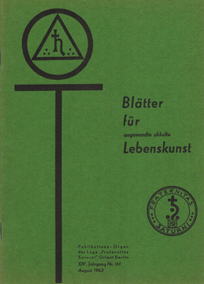 Blätter für angewandte okkulte Lebenskunst. XIV. Jahrgang, Nr. 161. Herausgegeben (als Privatdruck) von Gregor A. Gregorius. Meister der Loge Fraternitas Saturni Orient Berlin, Berlin 1963. 8°. S. 113-129. OKarton.