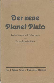 Brunhübner, Fritz: Der neue Planet Pluto. Beobachtungen und Erfahrungen. Diessen vor München, Jos. C. Hubers Vlg. 1935. Gr.-8°. Mit 1 Port., Textfig. u. 1 Tab. 138 S. OKart.