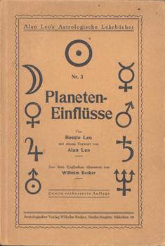 Planeten-Einflüsse. Mit einem Vorwort von Alan Leo. Aus dem Engl. Übers. von Wilhelm Becker. Bln.-Steglitz, Astrologischer Vlg. Wilhelm Becker o.J. 2. verb. Aufl. 100 S., 2 Bl. Vlgs.-Anz. OKart.
