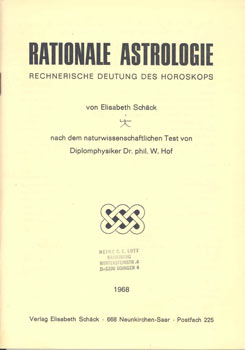 Schäck, Elisabeth: Rationale Astrologie. Rechnerische Deutung des Horoskops. Nach dem naturwissenschaftlichen Test von Diplomphysiker Dr. phil. W. Hof. Neunkirchen-Saar, Elisabeth Schäck 1968. [1. Aufl.]. Mit Fig. u. Tab. im Text. 48 S., [u. 4 S. zusätzlich nach S.2 eingeschoben]. OKart.
