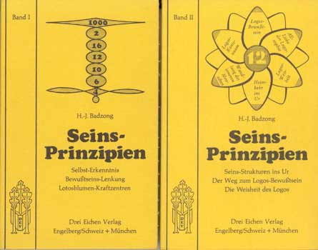 Badzong, H.-J.: Seins-Prinzipien. 2 Bde. Engelberg / Schweiz u. München, Drei Eichen Vlg. 1979-1980. 1. Auflage. Bd.I: Selbst-Erkenntnis. Bewußtseins-Lenkung. Lotosblumen-Kraftzentren. Mit 7 Zeichnungen. 108 S. Bd.II: Seins-Strukturen ins Ur. Der Weg zum Logos-Bewußtsein. Weisheit des Logos. Mit 4 Zeichnugen. 112 S. Flexible OLwd.-Bde.