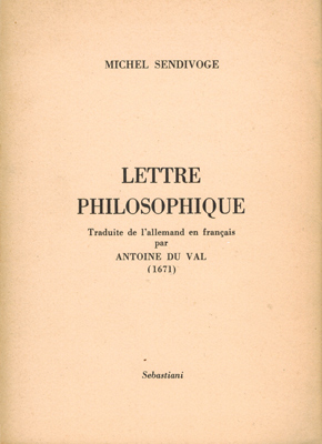 Sendivoge, Michel: Lettre Philosophique. Sebastiani, o.O. u. o.J. [1973]. Kl.-8°. Traduite de l’allemand en français par Antoine du Val (1671). 77 S., 1 Bl. OKarton.