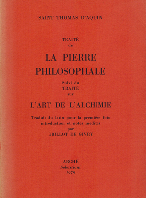 D’Aquin, Sant Thomas: Traité de la pierre philosophale suivi du Traité sur l’art de l’alchimie. Arché, Milano 1979. Traduit du latin pour la première fois introduction et notes inedites par [Emile-Jules] Grillot de Givry. 135 S, 2 Bl. OKarton.