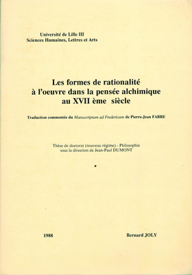 Joly, Bernard: Les formes de rationalité à l’oeuvre dans la pensée alchimique au XVII ème siècle. 2 Bände. Université de Lille III, o.O. [Villeneuve-d’Ascq] 1988. 4° [204x292 mm]. Traduction commentée du Manuscriptum ad Fredericum de Pierre-Jean Fabre [de Castelnaudary (auch: Petri Johannis Fabri, Faber)]. Thèse de doctorat (nouveau régime) – Philosophie sous la direction de Jean-Paul Dumont. 1 (w), 234 S., 1 (w); 1 (w), 1 Bl. S. [235]-423, 1 Bl., 1 (w) OKarton Bände.