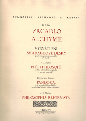 Symbolika, Alchymie a Kabaly. – Enthält weiterhin Beiträge bzw Auszüge aus: Vysvetlení Smaragdové Desky. Preklad z knihy „Geheime Figuren der Rosenkreuzer, aus dem 16ten und 17ten Jahrhundert“, podle rukopisných materiálu F. R. C., Titelblatt farbig. Johann Daniel Mylius: Peceti Filosofu, preklad z latinského originálu s novými komentári, mit 160 s/w Abbildungen und deren Beschreibung. Hieronymus Reusner: Pandora, to je nejvzácnejsí dar Bozi… (Symbolika Velkého Díla s výklladem), Titelblatt farbig und 19 s/w Abbildungen, S. 161-181. Johann Daniel Mylius: Philosophia Reformata, Titelblatt s/w und Abbildungen 182-244 und deren Beschreibung. Auszug aus: Johann de Monte Raphaim „Nekteré Poucky pro Zaky Prírody“. – Exemplar leicht berieben und bestoßen, sonst gutes Exemplar.