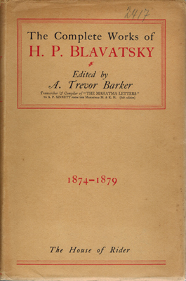 Barker, A. Trevor (Editor): The Complete Works of H. P. Blavatsky. 1874-1879 u. 1879-1881 (in two volumes). Rider & Co., London 1933. Gr.-8°. 358 S., 1 (w); 342 S., 1 (w) blaue OLwd. Bde. mit Rückengoldprägung und OUmschlägen.