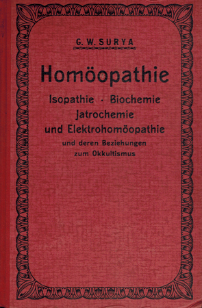 Surya, G. W. (Ps) = Demeter Georgiewitz Weitzer: Homöopathie, Isopathie, Biochemie, Jatrochemie und Elektrohomöopathie und deren Beziehungen zum Okkultismus. Verlag von Karl Rohm, Lorch (Württemberg) 1936. Vierte Auflage. 220 S., 2 Bl. Vlgs.-Anz.; 108 S., 2 Bl. Vlgs.-Anz. OHLwd.