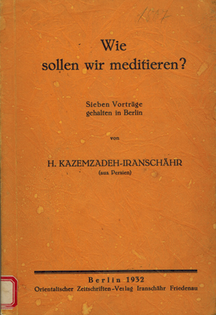 Iranschähr, H[ossein] Kazemzadeh: Wie sollen wir meditieren? Sieben Vorträge gehalten in Berlin. Orientalischer Zeitschriften-Verlag Iranschähr, Berlin-Friedenau 1932. Gr.-8°. 136 S. OKarton.