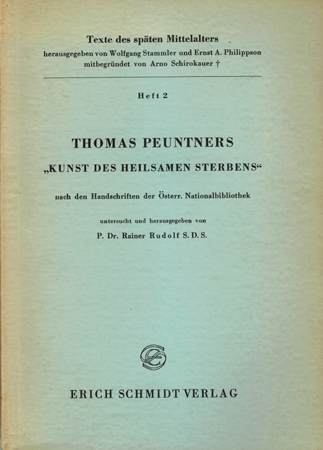 Rudolf, P. Dr. Rainer: Thomas Peuntners “Kunst des heilsamen Sterbens” nach den Handschriften der Österr. Nationalbibliothek. Erich Schmidt Verlag, Berlin 1956. 99 S. OKarton.
