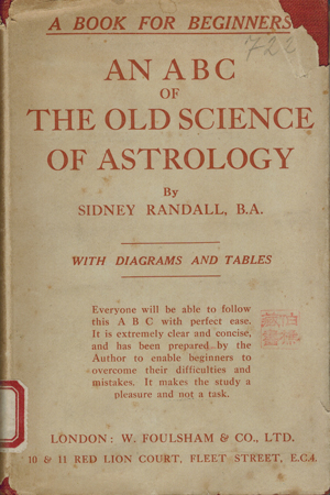 Randall, Sidney: An ABC of the Old Science of Astrology. W. Foulsham & Co., London o.J. [um 1920]. With Diagrams drawn by the Author also newly arranged Tables of Proportional Logarithms. 4 Bl., 104 S. OLwd.