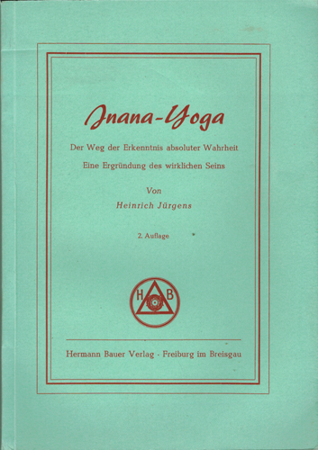 Jürgens, Heinrich: Jnana-Yoga. Der Weg der Erkenntnis absoluter Wahrheit. Eine Ergründung des wirklichen Seins. Hermann Bauer Verlag, Freiburg im Breisgau 1954. 2. Auflage. 77 S., 1 Bl. Vlgs.-Anz. OKarton.