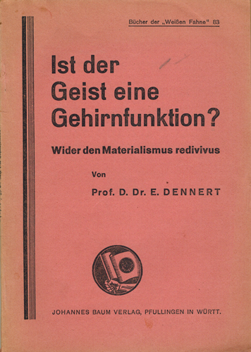Dennert, Prof. D. Dr. E.: Ist der Geist eine Gehirnfunktion? Wider den Materialismus redivivus. Johannes Baum Verlag, Pfullingen in Württ. o.J. [um 1933]. 57 S., 3 Bl. Vlgs.-Anz. OKarton.