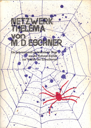 Eschner, M[ichael] D[ietmar]: Netzwerk Thelema. Die geheimnisvoll spektakulären Wege aus der Roboter-Einfalt zur Vielfalt der Erleuchteten. Johanna Bohmeier & Co. Verlag, Clenze 1985. 1 (w), 154 S., 2 (w) illustr. OKarton.