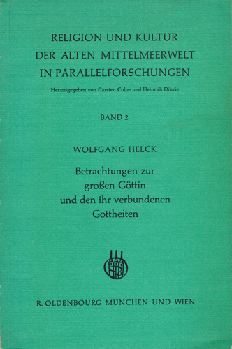 Helck, Wolfgang: Betrachtungen zur großen Göttin und den ihr verbundenen Gottheiten. R. Oldenbourg, München und Wien 1971. Gr.-8°. Herausgegeben von Carsten Colpe und Heinrich Dörrie. 307 S., 1 Bl., 1 (w) OKarton.