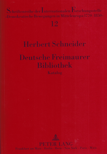 Schneider, Herbert: Deutsche Freimaurer Bibliothek. Katalog und Register. 2 Bände. Peter Lang Europäischer Verlag der Wissenschaften, Frankfurt am Main – Berlin – Bern – New York – Paris – Wien 1993. 1 Bl. 654 S. (Katalog); 4 Bl., S.655-1009, 2 Bl. Vlgs. Anz. 1 [w] (Register) rote OKarton Bde.