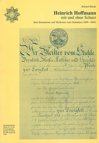 Hoede, Roland: Heinrich Hoffmann mit und ohne Schurz, dem Humanisten und Mediziner zum Gedenken (1809-1894). Selbstverlag der Freimaurerischen Forschungsgesellschaft Quatuor Coronati e. V., Bayreuth 1996. Gr.-8°. 91 S., 2 [w] illustr. OKarton.