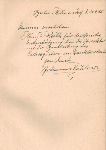 Mit mehrzeiliger und signierter Widmung von Johannes Vehlow an Fr. Reith für die Mitarbeit am Sachregister. – Umschlag leicht berieben und mit geringen Randläsuren, sonst ein gutes Exemplar.