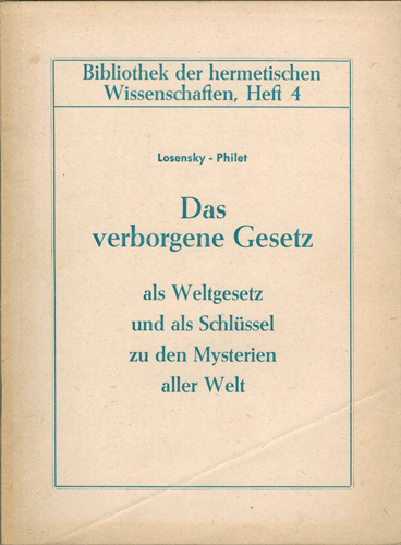 Losensky-Philet, [Willy]: Das verborgene Gesetz als Weltgesetz und als Schlüssel zu den Mysterien aller Welt. Isis Verlag, Gaustadt bei Bamberg 1956. Mit 10 teils farbigen Tafeln. 123 S., 1 Bl. OKarton.