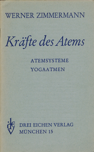 Zimmermann, Werner: Kräfte des Atems. Praktische Anleitungen. (Atemsysteme, Yogaatmen). Drei Eichen Verlag, München 1954. 25. Tausend. 31 S. OKarton.