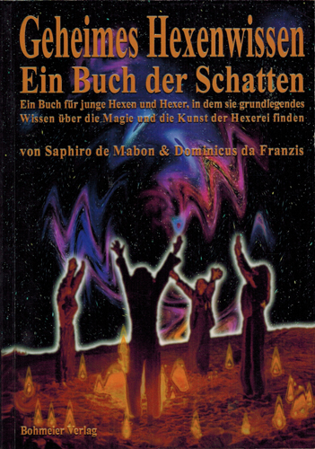 Mabon, Saphiro de, Franzis & Dominicus da: Geheimes Hexenwissen. Ein Buch der Schatten. Ein Buch für junge Hexen und Hexer, in dem sie grundlegendes Wissen über die Magie und die Kunst der Hexerei finden. Bohmeier Verlag, Lübeck 2002. 1. Auflage. 78 S., 1 Bl. Vlgs.-Anz. illustr. OKarton.