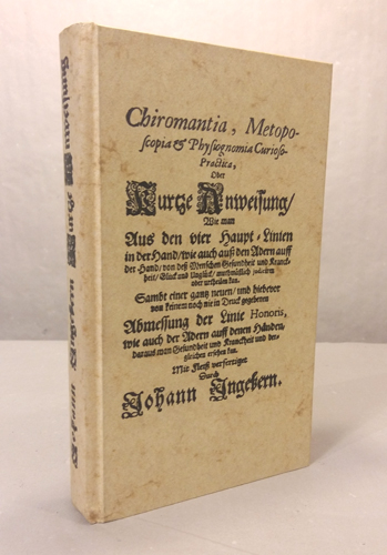 Ingeber, Johann: Chiromantia, Metoposcopia et Physiognomia Curiosa-Practica, Oder Kurtze Anweisung, wie man aus denen vier Haupt-Linien in der Hand, wie auch aus den Adern auff der Hand, von des Menschen Gesundheit, Glück und Unglück, muthmaßlich judiciren oder urtheilen kann. […]. Josef Gotthard Bläschke, Darmstadt o.J. [um 1980]. Mit 24 Abbildungen auf Tafeln. 6 Bl., 180 S., 2 Bl. illustr. OPp.