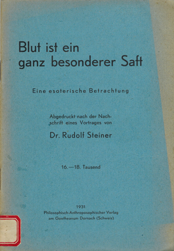 Steiner, Rudolf: Blut ist ein ganz besonderer Saft. Eine esoterische Betrachtung. Philosophisch-Anthroposophischer Verlag am Goetheanum, Dornach (Schweiz) 1931. 16.-18. Tausend. 48 S. OBroschur.
