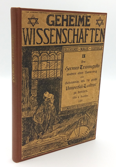 Geheime Wissenschaften. Eine Sammlung seltener älterer und neuerer Schriften über Alchemie, Magie, Kabbalah, Rosenkreuzerei, Freimaurerei, Hexen- und Teufelswesen etc. Unter Mitwirkung namhafter Autoren herausgegeben von A. v. d. Linden. Neunter Band. Originalgetreue Facsimile-Ausgabe (der Ausgabe) Leipzig, bey Adam Friedrich Böhme 1782. Hergestellt für Hermann Barsdorf Verlag durch Conrad Paris, Berlin im Jahre des Weltkrieges 1915. – Ackermann IV, 86. Brüning 5959 (Ausgabe 1920). Zur Ausgabe von 1782 siehe Ferguson I, S. 358; J. Neu 1796; Kopp II, S. 366; Schmieder S. 28 (5); Caillet 5100; Miers S. 287; Wolfstieg 43024. Zu Hermes Trismegistos siehe Biedermann S. 202, Roberts S. 314; ausführlich bei Bachmann/Hofmeier (Geheimnisse der Alchemie) S. 22 ff.; Priesner/Figala S.173-176. Nummerierte „Vorzugsausgabe“ einer kleinen Auflage auf besserem Papier. Dieses Exemplar trägt die Nummer 82. – Ein sehr gutes Exemplar.