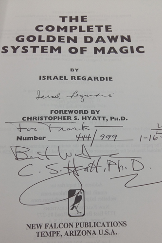 Zu Regardie siehe Miers S. 518. Zum Golden Dawn S. 255 u. 256. – Limitierte Auflage von 999 Exemplaren. Das Exemplar trägt die Nummer 444. Die Nummerierung, handschriftlich, sowie Datierung und Widmung mit Signatur von Christopher S. Hyatt [For Frank …]. – Inhalt: Introductory Section, mit 15 farb. Abbildungen auf Kunstdruck (4 Bl., unpaginiert) u. 3 s/w Abb., 46 S. / Vol. One: The Magical Alphabet, 2 Bl., 62 S. / Vol. Two: The Importance of Divination, 2 Bl., 63 S. / Vol. Three: The Core of the Tradition, 2 Bl., 98 S. / Vol. Four: Basic Techniques, 2 Bl, 60 S. / Vol. Five: Magical Fundamentals, 2 Bl., 109 S. / Vol. Six: Outer Order Rituals and Commentaries, 2 Bl., 153 S. / Vol. Seven: Rituals of the R.R. et A.C. with those of Waite’s Fellowship, 2 Bl., 158 S. / Vol. Eight: Other Order Rituals and magical Doctrines, 2 Bl., 76 S. / Vol. Nine: The Tarot (This includes Documents N, O, P, Q, R, and an Unlettered Theoricus Adeptus Minor Paper), 2 Bl., 91 S. / Vol. Ten: The Enochian System, 2 Bl., 174 S. / Volume Eleven: Appendices & Master Index, 2 Bl., 125 S. [alle 11 Teile mit zahlr. Abbildungen]. Beiträge u.a. von: V.H. FRATER A.M.A.G. [Dr. Israel Regardie], Francis King, G.H. FRATER S.R.M.D. [Mathers], G.H. FRATER N.O.M. [Westcott], G.H. FRATER D.D.C.F. [F. L. Gardner], V.H. SOROR V.N.R. [Mina/Moina Mathers], Frater De Profundis Ad Lucem [F. L. Gardner], G.H. FRATER SUB SPE [J. B. Brodie-Innes], Thomas Head, V.H. FRATER S.I.A., G. H. FRATER S. A. [Westcott], David Allen Hulse. – Leinen schwach berieben, sonst gutes Exemplar.