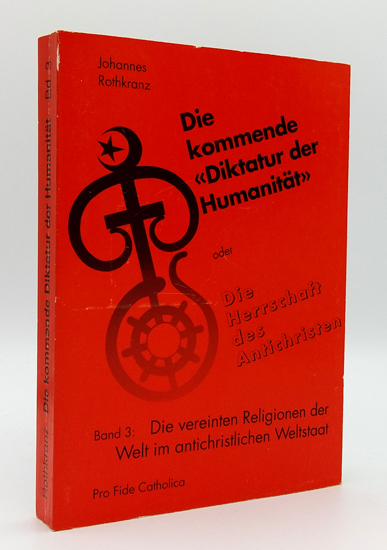 Rothkranz, Johannes: Die kommende Diktatur der Humanität oder Die Herrschaft des Antichristen. Band 3: Die vereinten Religionen der Welt im antichristlichen Weltstaat. Verlag Anton A. Schmid, Durach 1990. Mit 16 Abbildungen auf Tafeln. 259 S., 1 Bl. Vlgs.-Anz. illustr. OKarton.