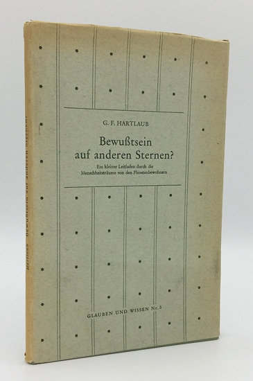 Hartlaub, G[ustav] F[riedrich]: Bewußtsein auf anderen Sternen? Ein kleiner Leitfaden durch die Menschheitsträume von den Planetenbewohnern. Ernst Reinhardt Verlag A.G., Basel 1950. 65 S. 1 Bl. Vlgs.-Anz. OLwd. mit Goldprägung und OUmschlag.