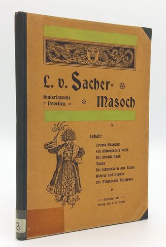 Sacher-Masoch L[eopold] v[on].: Grausame Frauen. Hinterlassene Novellen [Band II]. Verlag von H. R. Dohrn, Dresden 1901. 2 Bl., 93 S., 1 Bl. Vlgs.-Anz. HLwd. mit aufgezogener OBroschur.