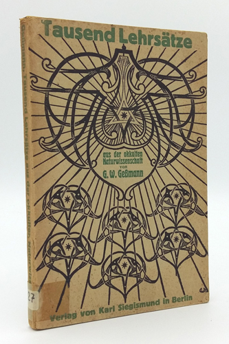 Geßmann, Gustav W[ilhelm]: Tausend Lehrsätze aus der Okkulten Naturwissenschaft. Verlag von Karl Siegismund, Berlin 1922. Zweite, sehr erweiterte, mit Auszügen aus Eckartshausen “Magie” ergänzte Auflage von “DIe Welt der Gedanken” und einem Anhang über astrologische Signaturen und Monatsdiagnosen. Mit einer Einführung von G. W. Surya [d.i. Demeter Georgiewitz Weitzer]. 159 S. illustr. OKarton.