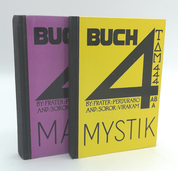 Crowley, Aleister (Frater Perdurabo u. Soror Virakam): Buch 4. Teil I: Mystik und Teil II: Magie. 2 Bände. Verlag Psychosophische Gesellschaft, Zürich o.J. (um 1960) 12°. Autorisierte Übersetzung von Martha Küntzel. Mit Textabbildungen. 127 S.; IX, 1 Bl., 221, 2 Bl. S. OKart. Bde.