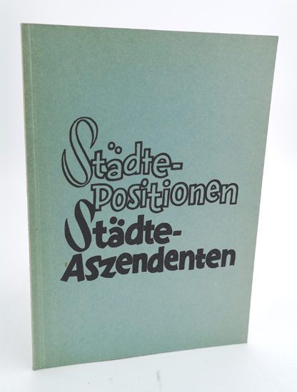Geographische Positions-Tabelle mit Städte- u. Länder-Aszendenten. Tabellen der geographischen Positionen der 550 wichtigsten Städte der Welt und ihre Zuteilung zu den Tierkreiszeichen (also mit Angabe der Städte – Aszendenten). Verlag Baumgartner, Warpke, Post Billerbeck / Hann. o.J. (um 1954). 30 S., 3 Bl. OKarton.