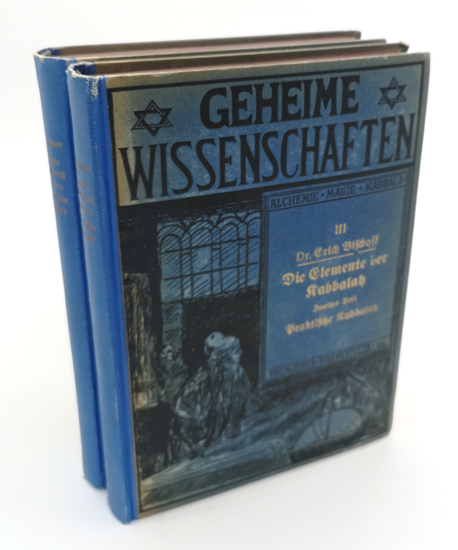 Bischoff, Dr. Erich: Die Elemente der Kabbalah. 2 Bände. Hermann Barsdorf Verlag, Berlin 1920. Zweite Auflage. 229 S., 1 Bl. Vlgs.-Anz., 239 S. Illustr. blaue OHLwd. mit Rücken und Deckel Goldprägung.