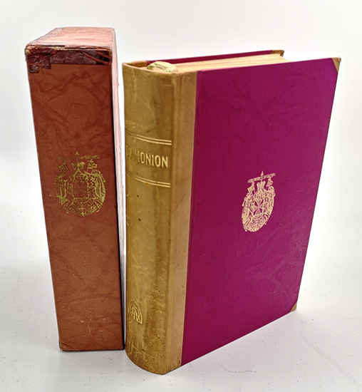 Bloch S. 99. – “Das Werk »Pandaimonion« bringt in der leichten Fassung eines dämonischen Romans Enthüllungen und Offenbarungen Über jene tiefst verborgenen Dinge der Welt und des Lebens, die zu gewichtig – in ihrer Wirkung zu folgenschwer und – zu gefährlich sind, als daß sie anders als unter der Narrenkappe behandelt werden dürften. Darum wurden sie bisher fast nie behandelt und sind – trotz ergiebiger okkulter Literatur – großenteils neu und unerhört” (Aus der Einführung des Herausgebers). – Erste Ausgabe als “Luxus-Ausgabe” mit allen 5 Bänden in einem sehr schönen und höchst dekorativen Halblederband und einem Original Papp-Schuber. – Der sehr seltene Schuber mit kl. Randläsuren, leicht berieben, gering bestoßen, lichtrandig u. an einer der oberen Kanten verstärkt. Lederrücken schwach berieben, eine Ecke minimal bestoßen, sonst ein sehr gutes Exemplar.