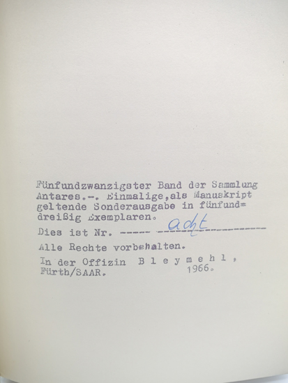 Fünfundzwanzigster Band der Sammlung Antares. Einmalige, als Manuskript geltende Sonderausgabe in fünfunddreißig Exemplaren. Dies ist Nr. 8 (acht, handschriftl.). – „Antares ist ein Stern erster Größe, ein roter Überriese, der hellste im Sternbild Skorpion, im sichtbaren Bereich 10.000 mal heller als die Sonne und fast 800 mal so groß; sein Durchmesser beträgt 1000 Millionen Kilometer, 600 Lichtjahre entfernen ihn von der Erde. Jakob Bleymehl wählte diesen Stern nicht zufällig als Titel seiner Folge von insgesamt 30 Drucken uto-phantastischer Seltenheiten, die er in der kurzen Zeit von 1964 bis 1967 in meist winzigen Auflagen herausbrachte, alles selbst gefertigt, jede Seite ein Abzug im Spiritus-Umdruckverfahren: „Sammlung Antares“, 30 mal Zahl der Seiten mal Anzahl der Exemplare – eine gewaltige Leistung“ (Aus: 3. Robert-Kraft-Symposiums-Band 2019). – Exemplar aus der Bibliothek von Walter Englert. Rücken mit Bestandsnummer (ist abgefallen, liegt lose bei). Bis auf die kl. Rückstände der Bestandsnummer ein tadelloses Exemplar. Äußerst selten.